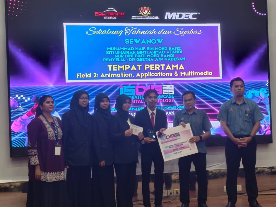 28 Oktober 2025 - Jabatan Perdagangan, Politeknik Tuanku Sultanah Bahiyah (PTSB) terus mencipta kecemerlangan apabila berjaya meraih tempat pertama dalam Kategori Animasi & Multimedia sempena 2nd Innovation Showcase in Digital Technology 2025 (ISDIG’25) yang diadakan pada hari ini di Politeknik Balik Pulau (PBU), Pulau Pinang.